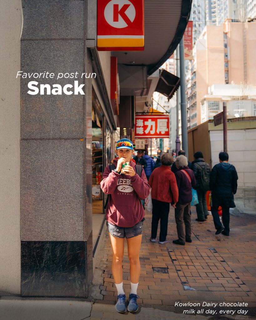 Kowloon Dairy chocolate milk all day, every day. They’re great for getting in some protein, sugar, and fats to help your recovery straight after a run. They’re also really accessible and seem to sit well in my stomach.