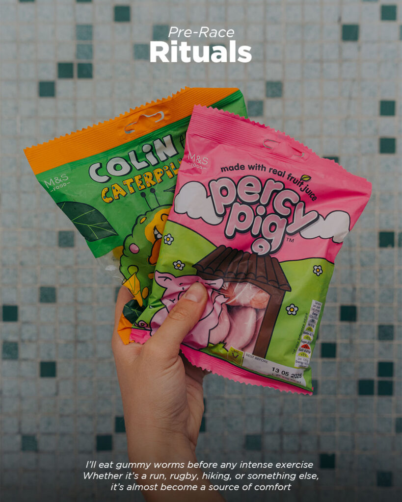 I’ll eat gummy worms before any intense exercise – whether it’s a run, rugby, hiking, or something else. It’s almost become a source of comfort. I also like eating a bagel the morning of any big match or event and setting out my outfit the night before.